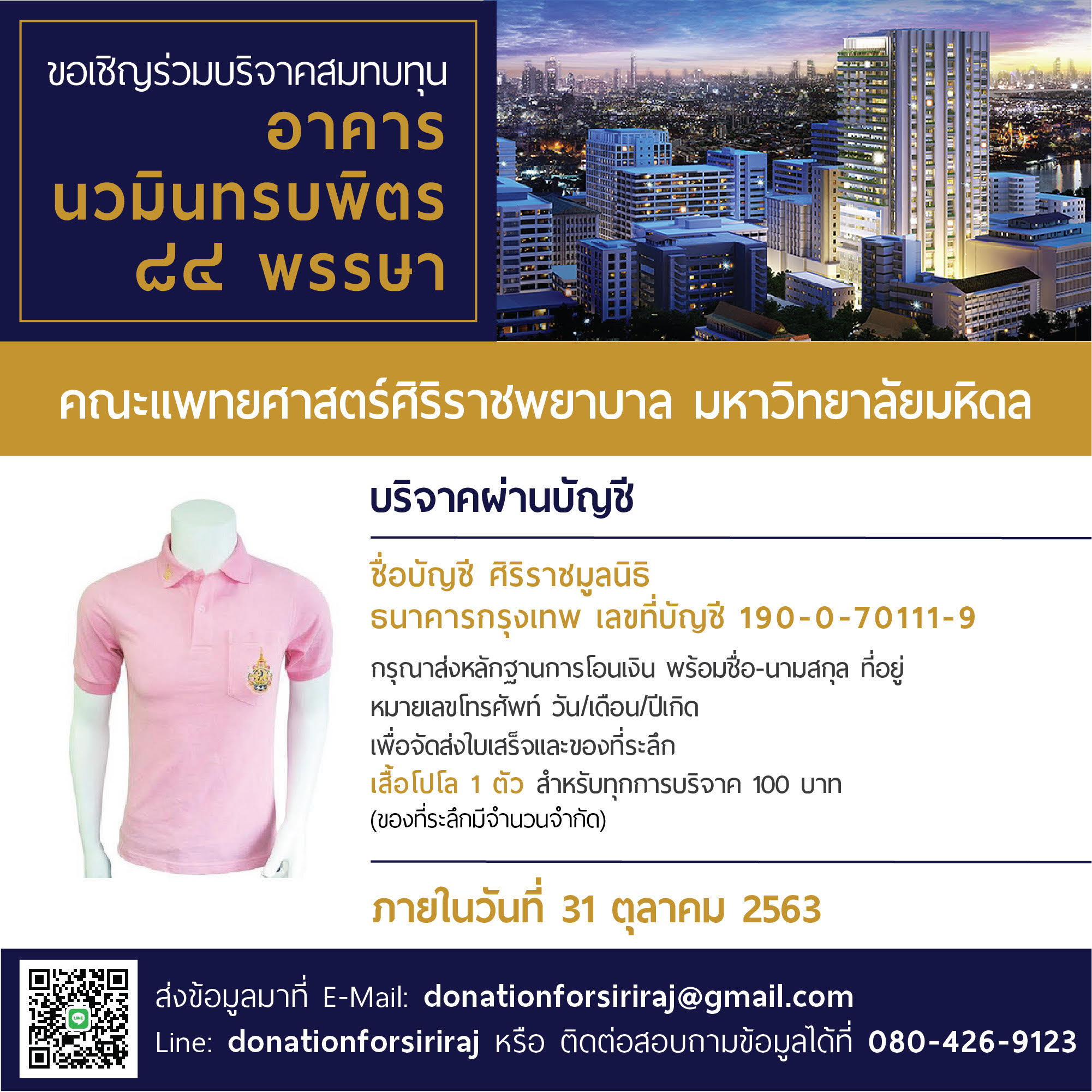 ศิริราชมูลนิธิ ขอเชิญชวนผู้มีจิตศรัทธาร่วมบริจาคสมทบทุนอาคารนวมินทรบพิตร ๘๔ พรรษา โรงพยาบาลศิริราช เพื่อนำเงินไปจัดซื้อเครื่องมือและอุปกรณ์ทางการแพทย์ โดยผู้สนใจสามารถร่วมบริจาคได้ที่บัญชี ศิริราชมูลนิธิ ธนาคารกรุงเทพ เลขที่ 190-0-70111-9 พร้อมกับส่งหลักฐานการโอนเงิน ชื่อ-นามสกุล ที่อยู่ หมายเลขโทรศัพท์ และวัน/เดือน/ปีเกิด ผ่านทางอีเมล์ donationforsiriraj@gmail.com หรือไลน์ donationforsiriraj เพื่อจัดส่งใบเสร็จและของที่ระลึก โดยทุกการบริจาค 100 บาท จะได้รับเสื้อโปโลจำนวน 1 ตัว (ของที่ระลึกมีจำนวนจำกัด) เงินทุกบาทจะเข้าบัญชีของศิริราชมูลนิธิโดยตรง โดยไม่มีค่าใช้จ่ายใดๆ ทั้งสิ้น สำหรับรายละเอียดเพิ่มเติม สามารถสอบถามข้อมูลได้ที่งานประชาสัมพันธ์ศิริราช โทร. 0 2419 7646-8 และศิริราชมูลนิธิ โทร. 0 2419 7658-60