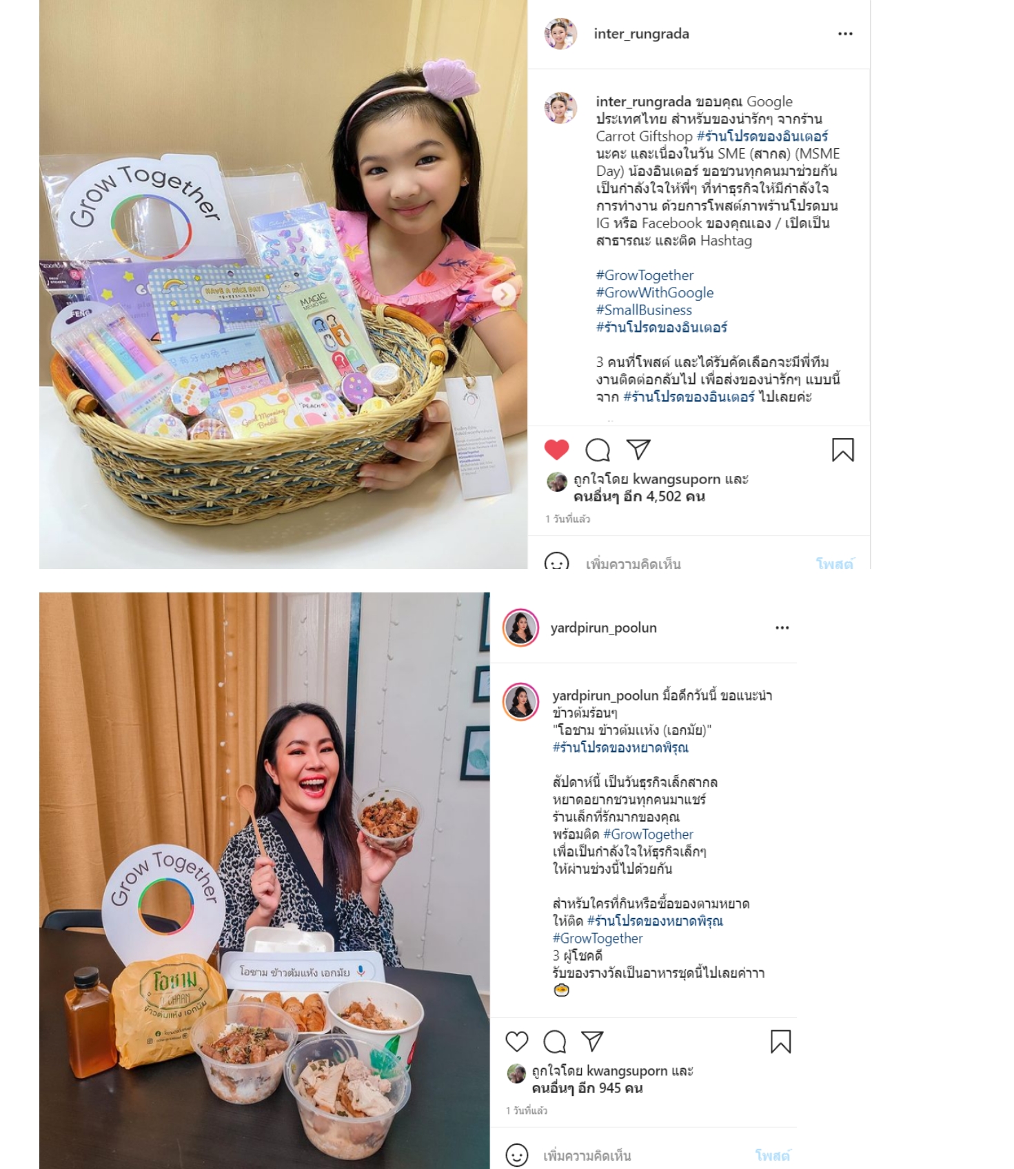 นอกจากนี้ Google ประเทศไทย ยังได้จัดแคมเปญพิเศษ “Grow Togegther” เพื่อร่วมส่งกำลังใจให้กับธุรกิจ SME ด้วยการเชิญอินฟลูเอนเซอร์และบุคคลที่เป็นที่รู้จักในแวดวงต่างๆ ในประเทศไทย อาทิ อเล็กซ์ เรนเดลล์, พลอยชมพู (Jannine Weigel), ติ๊นา ศุภนาฎ, บี้ เดอะ สกา, น้องอินเตอร์ รุ่งลดา, นิว นภัสสร, หยาดพิรุณ และ เอิ๊ต ภัทรวี มาร่วมกันแชร์ความรักและความประทับใจจากร้านเล็กๆ ที่พวกเขารัก ซึ่งมีทั้งร้านอาหารคาวและอาหารหวาน อาทิ ร้านโอชาม ข้าวต้มแห้ง, ร้านผัดไทคุณชู, ร้านโคตรยำ, ห้วยขวาง, ร้านลูกอิน พิซซ่ากล้วย และ ร้าน Paul Scone ด้วยการโพสต์ลงในช่องทางโซเชียลของตนเอง พร้อม #GrowTogether #GrowWithGoogle และ#SmallBusiness ทั้งนี้ ยังมีการเล่นเกมสนุกๆ กับแฟนเพจโดยให้แฟนๆ แชร์ร้านโปรดของตัวเองแล้วติดแฮชแท็ก แบบเดียวกัน ผู้โชคดีที่ได้รับเลือกก็จะได้รับรางวัลเพื่อช่วยอุดหนุนร้านเล็กๆ ในโพสต์ของอินฟลูเอ็นเซอร์ที่ตนเองติดตาม ซึ่งเป็นการช่วยกระตุ้นรายได้ให้กับเจ้าของธุรกิจได้อีกช่องทางหนึ่ง