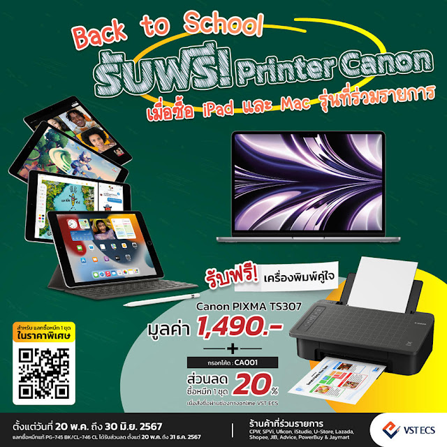 - Macbook Air 13-inch (M1, Macbook Air 13-inch (M2), Macbook Air 15-inch (M2), Macbook Pro 14-inch (M2), Macbook Pro 16-inch (M2), iPad (รุ่นที่9), iPad (รุ่นที่ 10), iPad Pro 11-inch (รุ่นที่ 4), iPad Pro 12.9-inch (รุ่นที่ 6), จะได้รับ Canon PIXMA TS307 มูลค่า 1,490 บาท และพิเศษ ส่วนลด 20% เมื่อซื้อหมึกพิมพ์เพิ่มเติม 1 ชุด เมื่อใช้ Code ส่วนลด CA001 ในช่องทางการซื้อที่ร่วมรายการ